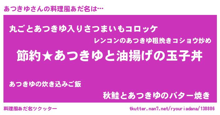 | 男性向けラノベタイトル風あだ名 | 『あつきゆの憂鬱』『魔弾の王とあつきゆ』 |