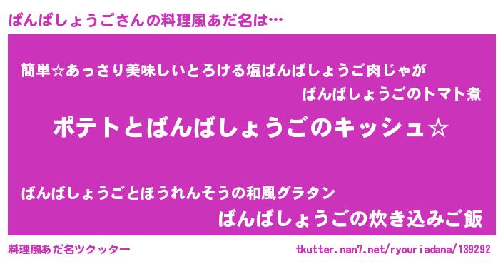 女子向けラノベタイトル風あだ名 | 『ばんばしょうごの卵を拾いまして』 |