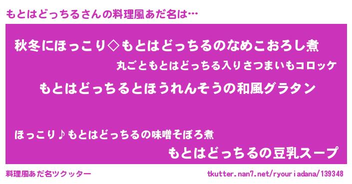 | 女子向けラノベタイトル風あだ名 | 『もとはどっちるの玉の輿計画!』 |