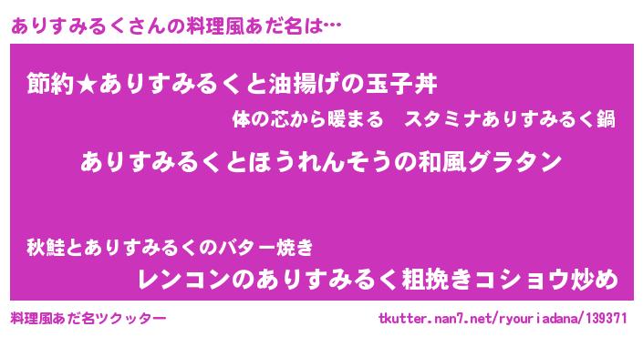 | 胡散臭い通販商品みたいなあだ名 | 『億万長者になれる霊験あらたかなお札…その名も「ありすみるく」』 |