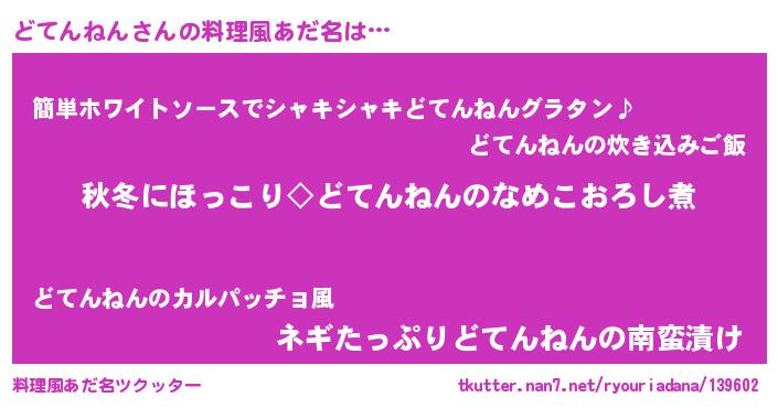 | 男性向けラノベタイトル風あだ名 | 『どてんねんに滅ぼされるだけの簡単なお仕事です』 |