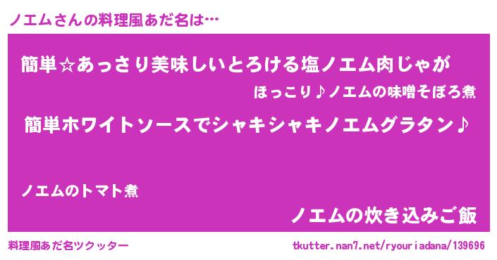 | 男性向けラノベタイトル風あだ名 | 『ノエムの嫁は女の子じゃないと思った?』 |