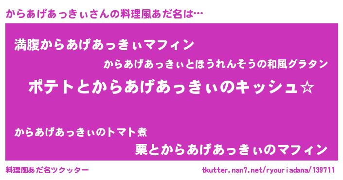 | 男性向けラノベタイトル風あだ名 | 『からあげあっきぃの嫁は女の子じゃないと思った?』 |