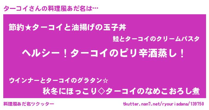 | 女子向けラノベタイトル風あだ名 | 『闇のターコイ』『死神ターコイの再婚』 |