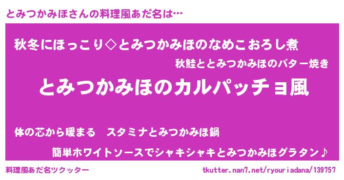 | 男性向けラノベタイトル風あだ名 | 『魔弾の王ととみつかみほ』 |