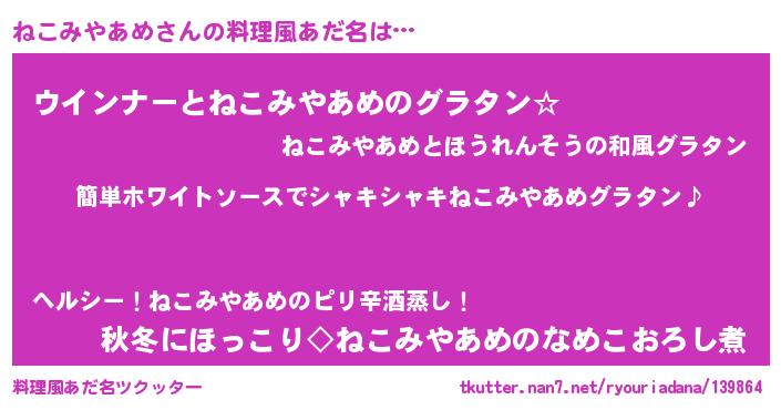 | 男性向けラノベタイトル風あだ名 | 『ねこみやあめの嫁は女の子じゃないと思った?』 |