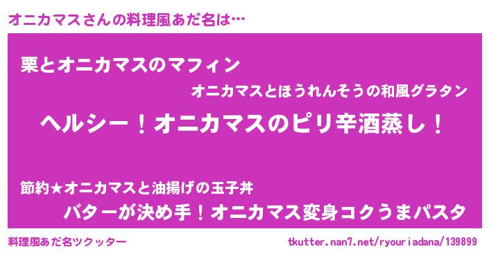 | 男性向けラノベタイトル風あだ名 | 『Re:オニカマスから始める異世界生活』 |