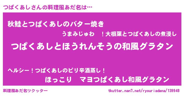 | 女子向けラノベタイトル風あだ名 | 『つぱくあしの玉の輿計画!』 |