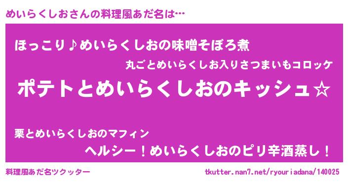 | 男性向けラノベタイトル風あだ名 | 『めいらくしおの嫁は女の子じゃないと思った?』 |