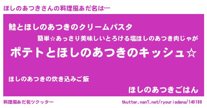 | 女子向けラノベタイトル風あだ名 | 『ほしのあつきの卵を拾いまして』 |