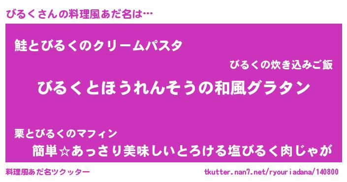 | ヘコむあだ名 | 『びるく(爆)』『酢こんぶ』『びるを』 |