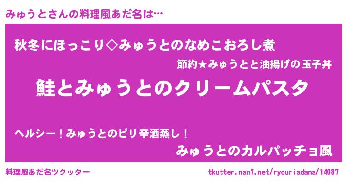 | 女子向けラノベタイトル風あだ名 | 『死神みゅうとの再婚』『闇のみゅうと』 |
