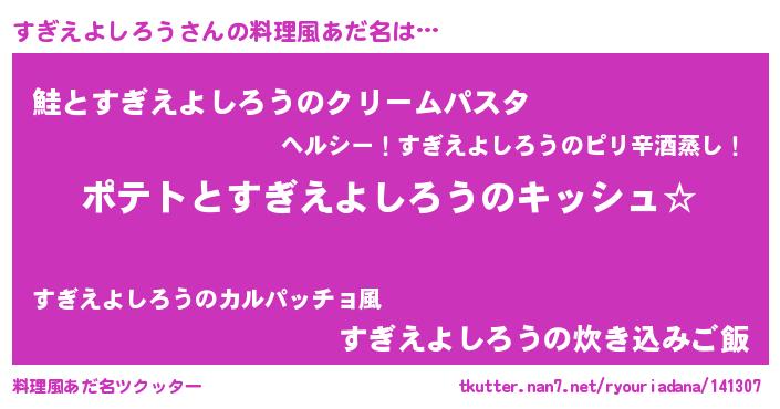 | 男性向けラノベタイトル風あだ名 | 『すぎえよしろうの嫁は女の子じゃないと思った?』 |