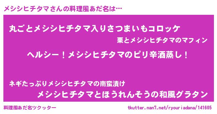 | 男性向けラノベタイトル風あだ名 | 『Re:メシシヒチタマから始める異世界生活』 |