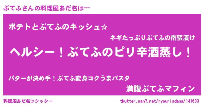 | 男性向けラノベタイトル風あだ名 | 『Re:ぶてふから始める異世界生活』 |