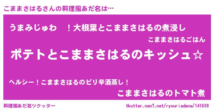 | 男性向けラノベタイトル風あだ名 | 『こままさはるの嫁は女の子じゃないと思った?』 |