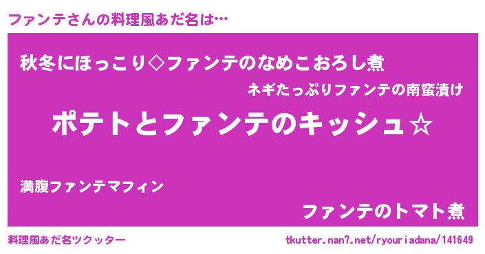 | 男性向けラノベタイトル風あだ名 | 『ファンテの嫁は女の子じゃないと思った?』 |