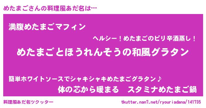 | 男性向けラノベタイトル風あだ名 | 『めたまご~年齢イコール彼女いない歴の魔法使い~』 |