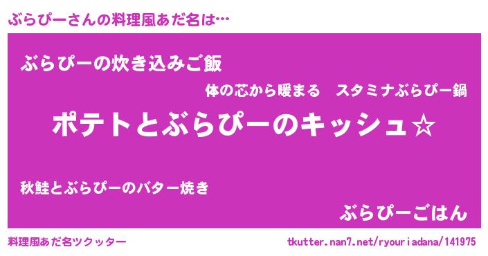 | 女子向けラノベタイトル風あだ名 | 『ぶらぴーの卵を拾いまして』 |