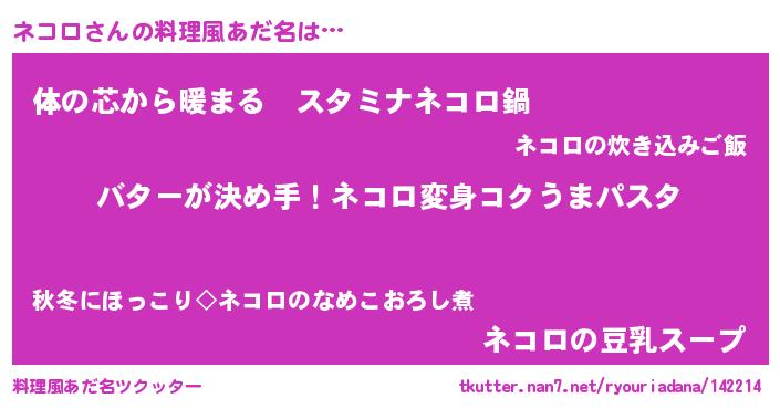 | 女子向けラノベタイトル風あだ名 | 『ネコロ恋絵巻』『ネコロの雑貨屋さん』 |