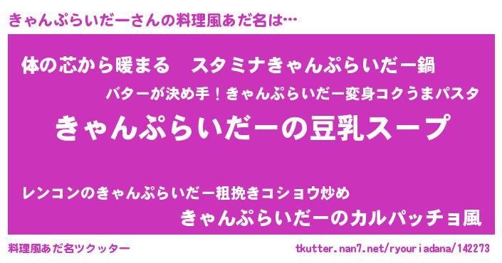 | 胡散臭い通販商品みたいなあだ名 | 『信頼と実績のサプリメント…その名も「きゃんぷらいだー」』 |
