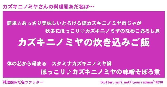 | 意味不明あだ名 | 『永久保存カズキニノミヤ』 |