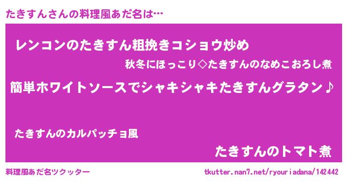 | 男性向けラノベタイトル風あだ名 | 『たきすんの嫁は女の子じゃないと思った?』 |