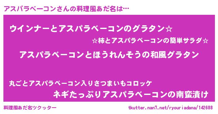 | 女子向けラノベタイトル風あだ名 | 『アスパラベーコンの玉の輿計画!』 |