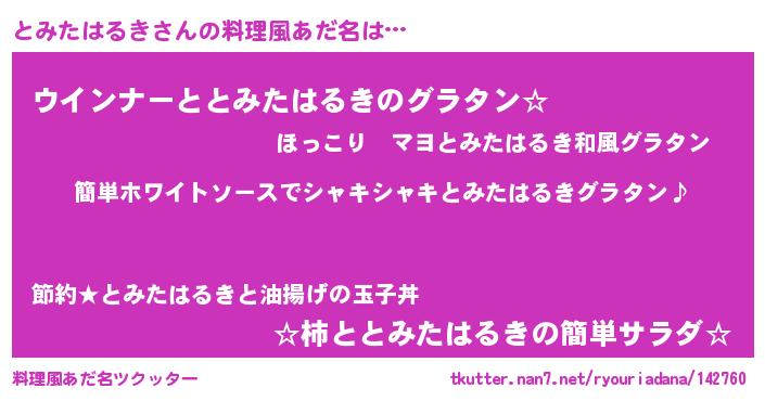 | 男性向けラノベタイトル風あだ名 | 『とみたはるきの嫁は女の子じゃないと思った?』 |