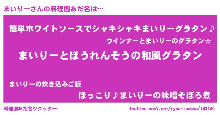 | 男性向けラノベタイトル風あだ名 | 『まいりー~年齢イコール彼女いない歴の魔法使い~』 |