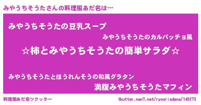| 胡散臭い通販商品みたいなあだ名 | 『信頼と実績のサプリメント…その名も「みやうちそうた」』 |