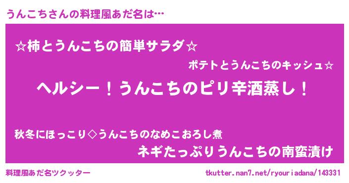 | 男性向けラノベタイトル風あだ名 | 『Re:うんこちから始める異世界生活』 |