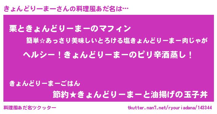 | 男性向けラノベタイトル風あだ名 | 『Re:きょんどりーまーから始める異世界生活』 |