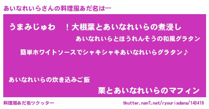 | 男性向けラノベタイトル風あだ名 | 『あいなれいらの嫁は女の子じゃないと思った?』 |