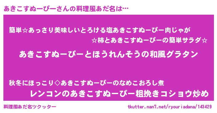 | 男性向けラノベタイトル風あだ名 | 『転生したらあきこすぬーぴーだった件』 |