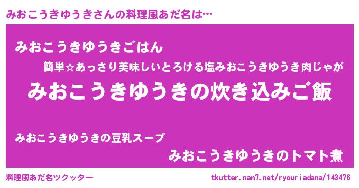 | 男性向けラノベタイトル風あだ名 | 『うちのみおこうきゆうきが世界を掌握している!』 |