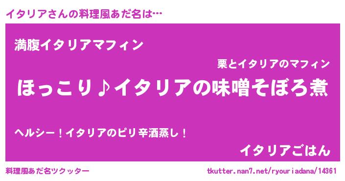 | 男性向けラノベタイトル風あだ名 | 『イタリアの憂鬱』『イタリアスレイヤー』 |