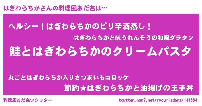 | 男性向けラノベタイトル風あだ名 | 『ノーゲーム・ノーハギワラチカ』 |