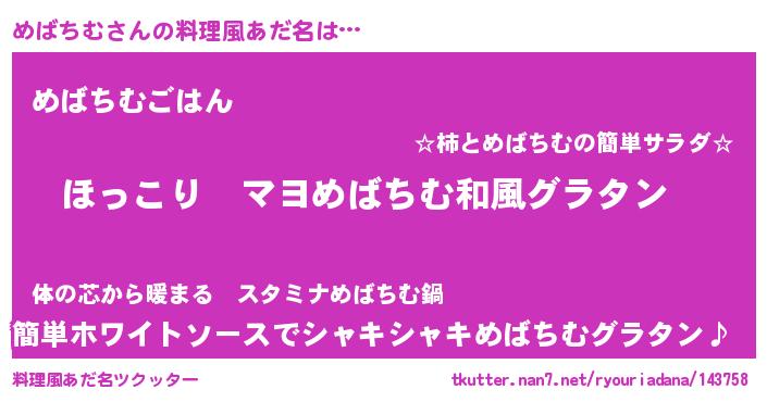 | 意味不明あだ名 | 『住所不定無職めばちむ(93歳)』 |