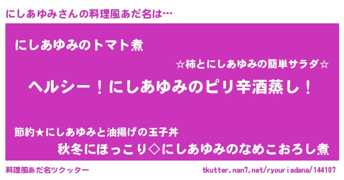 | 意味不明あだ名 | 『自称にしあゆみ』『ペロリンにしあゆみ』 |