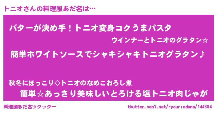 | 男性向けラノベタイトル風あだ名 | 『トニオの嫁は女の子じゃないと思った?』 |