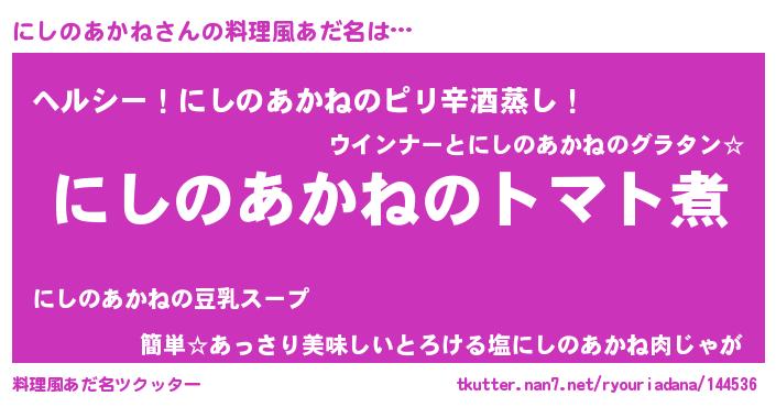 | 女子向けラノベタイトル風あだ名 | 『にしのあかね夫妻のなれそめ』 |