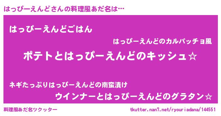 | 男性向けラノベタイトル風あだ名 | 『はっぴーえんどの嫁は女の子じゃないと思った?』 |