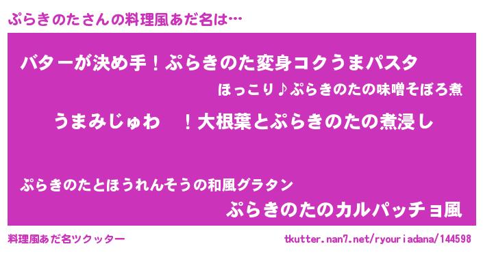 | 胡散臭い通販商品みたいなあだ名 | 『運命の人と巡り会える高級そうな壺…その名も「ぷらきのた」』 |