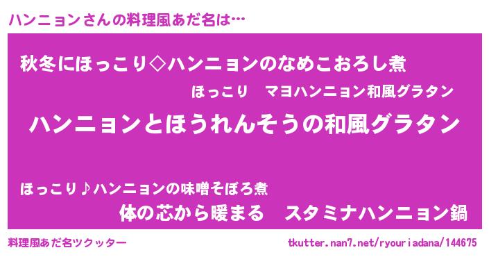 | 女子向けラノベタイトル風あだ名 | 『ハンニョンの玉の輿計画!』 |