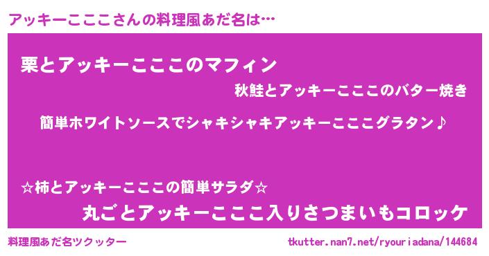 | 男性向けラノベタイトル風あだ名 | 『アッキーこここの嫁は女の子じゃないと思った?』 |