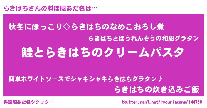 | 男性向けラノベタイトル風あだ名 | 『ノーゲーム・ノーラキハチ』 |