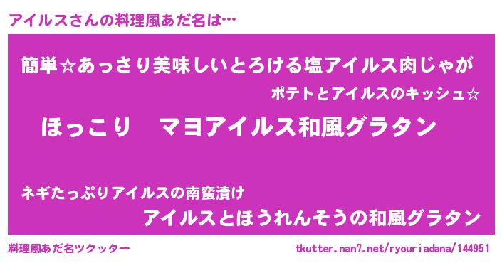 | 男性向けラノベタイトル風あだ名 | 『この素晴らしい世界にアイルスを!』 |