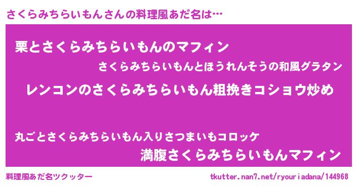 | 女子向けラノベタイトル風あだ名 | 『さくらみちらいもんなんてお断りですっ。』 |