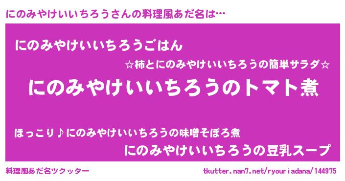 | 男性向けラノベタイトル風あだ名 | 『おまえをオタクにしてやるから、俺をにのみやけいいちろうにしてくれ! 』 |